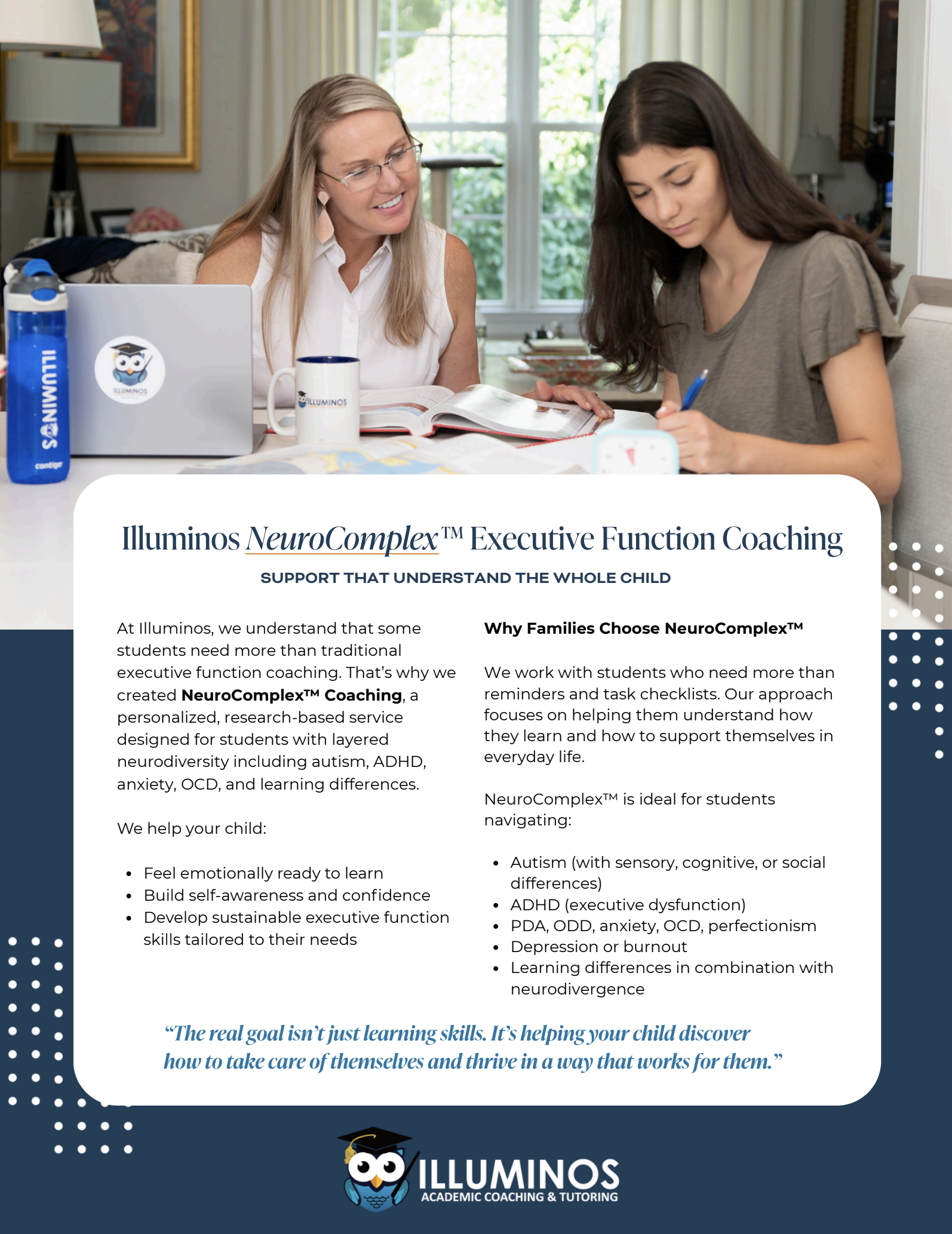 Our NeuroComplex Coaching is designed for students with complex neurodiversity, particularly those navigating multiple diagnoses or traits that make it challenging for them to thrive with conventional strategies. This level of care expands upon Illuminos’ foundational EF coaching model, offering more personalized, flexible, and affirming support for students who need it most.